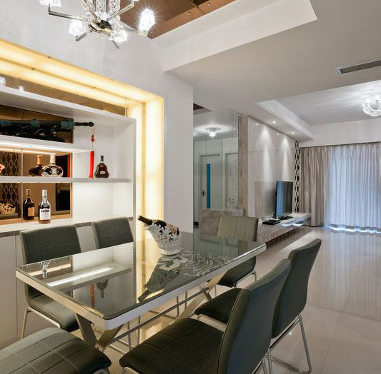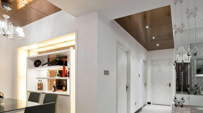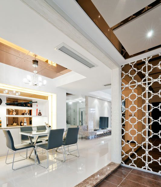 接手本案例時業主工程已經進行到木作。整個空間設計上只能不改動原有的大體格局的情況下,在后期的木作和軟裝去調整,設計手法的運用上試著用純粹干凈的線條搭配出溫馨柔和的自然色調。原有的入戶空間與餐廳空間、客廳背景與洗手干區在造型、色彩與材質上相互的銜接,讓空間巧妙融合。入戶玄關的暗門上運用了密度板的樓花造型,深色茶鏡在樓花的造型映襯上顯的格外的靈動。并于吊頂相互的銜接,使得天花的視覺上有了無限延伸效果,餐廳處備餐柜兼具實用與隔斷功能,周邊的柱子運用透光云石的修飾,備餐柜成為了餐廳空間的主軸。客廳空間電視柜的石頭臺面貫通至洗手臺處,高低錯落感讓臺面凸顯出層次。削弱了單一感。幾只蝴蝶的掛簾給空間帶來了生活的情趣感。