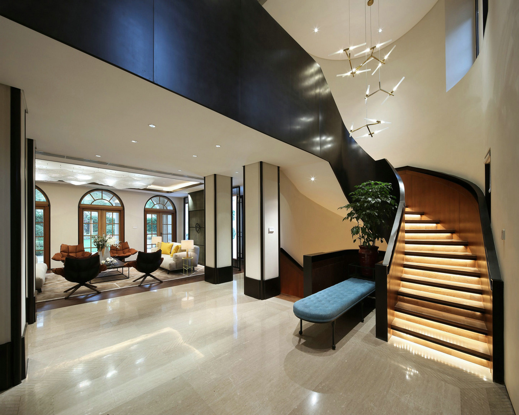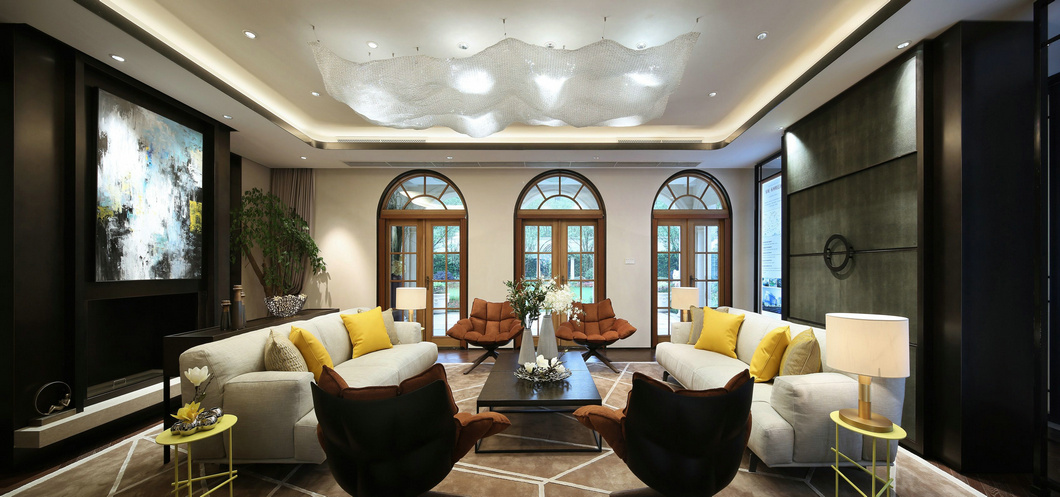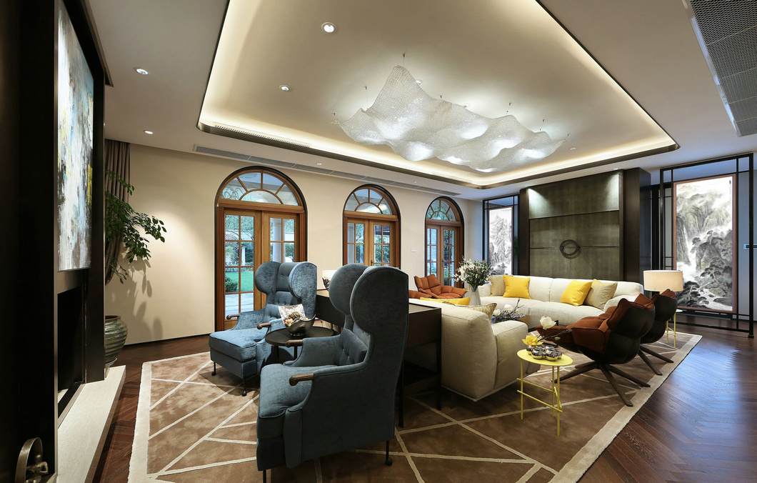 整個戶型格局為兩層帶地下室。風(fēng)格定位為新都市現(xiàn)代風(fēng)格。適合現(xiàn)代生活需求的同時,向傳統(tǒng)審美致敬。藍色算是塑造寧靜感覺的更佳色彩,在以白色為背景的硬裝里,黃昏藍和氣質(zhì)米的現(xiàn)代沙發(fā)讓空間冷靜、沉穩(wěn)。沙色的地毯適度地緩解了空間高冷氣息,另外點綴色選用了嬰兒黃,提亮空間,引人注意之外,也增加了空間的層次感。適量的皮革搭配,讓現(xiàn)代里又帶上了一絲不一樣的質(zhì)感。用材質(zhì)和顏色的混搭來區(qū)分空間的功能性以及不同年齡客戶的生活需求。這里有沙色的土壤,洗凈的藍天,平靜的大海,每天睜開眼你都是快樂的。