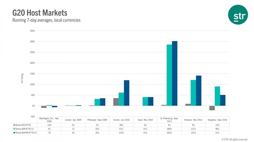 近日G20峰會(huì)在德國漢堡舉辦,截至7月8日,STR分析了前八個(gè)主要酒店市場的七天平均值。為了反映漢堡的潛在結(jié)果,分析排除了三個(gè)市場(法國戛納,墨西哥Los Cabos和土耳其Serik),以維持大型酒店市場的基準(zhǔn)重點(diǎn)。七天滾動(dòng)平均法計(jì)算了5天內(nèi)每個(gè)事件所產(chǎn)生的酒店業(yè)務(wù)以及為期兩天的活動(dòng)本身。