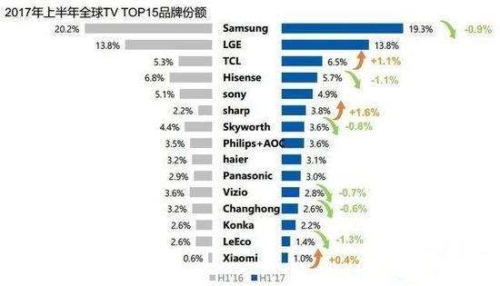 從這個(gè)圖表可以看出,2017年上半年全球TOP15的彩電品牌中,互聯(lián)網(wǎng)品牌僅有樂(lè)視和小米,傳統(tǒng)電視品牌依然占據(jù)了絕對(duì)的主力。上半年樂(lè)視銷量總占比下滑1.3%,但這部分下滑的銷量顯然并沒(méi)有全部被小米奪取,因?yàn)樾∶自诳傠娨暿袌?chǎng)的銷量增幅僅為0.4%。