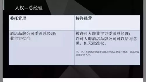 與委托管理最大的區別就是酒店品牌公司是將其旗下的品牌的使用權以及它品牌背后相應的知識產權,所有品牌在建設時期的建造、機電、內裝以及在酒店開業之后的所有的營運SOP的標準全部特許給酒店的業主方來使用,酒店的業主方需要自行組建團隊或者是聘用第三方的管理公司的團隊來運營酒店酒店。品牌公司不出管理的團隊,那么也就是說在酒店的日常經營當中的人、財、物是由業主方來掌控的。