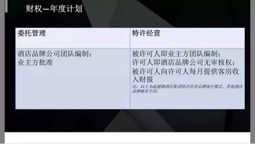 也比如說品牌公司認為你的年度計劃編撰的不夠成功,必須要改這種情況在特許經營的合作模式向下是不可能發生的,那么酒店日常經營的過程當中每項財務的支出的報批已審批,自然而然,也就是歸結于業主方的團隊自行來打理,所以也就是表明在特許經營的酒店日常經營的財權實際上是在業主方自行組建的團隊那里,酒店品牌公司是不可以參與的。這個與委托管理的合作模式下品牌公司對于酒店的年度計劃以及酒店每一項成本支出都有一個控制和審批權比起來是有非常大的區別。