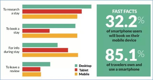 酒店要做成功的營銷,就需要盡可能多地了解消費(fèi)者在搜索、規(guī)劃和預(yù)訂方面的用戶習(xí)慣。消費(fèi)者在整個旅游規(guī)劃中所瀏覽的網(wǎng)站數(shù)量正在變少,那么他們又有哪些不同的工具和信息來源呢?調(diào)查中,F(xiàn)ueltravel要求參與者填寫有關(guān)使用何種設(shè)備來進(jìn)行搜索、規(guī)劃和預(yù)訂的問卷。報告顯示,臺式機(jī)和筆記本電腦仍然是消費(fèi)者最主要的搜索和預(yù)訂設(shè)備,但仍有越來越多的消費(fèi)者開始頻繁地使用移動端設(shè)備來完成旅游產(chǎn)品的搜索和預(yù)訂,這也是未來用戶端的發(fā)展趨勢。