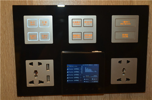 打開房門,即刻傳來音樂歡迎提示。進入房間后,記者通過觸控按鍵分別嘗試了睡眠、電視、閱讀、休閑等多種模式。做出選擇的一剎那,燈光、空調等房間設施聯動調整,營造最合適的環境。除了觸控按鍵,記者也通過手機嘗試了各種模式的切換,操作過程也非常流暢。通過藍牙,記者將手機里的音樂傳輸到房間背景音樂,整個房間瞬間充盈著曼妙的音樂。