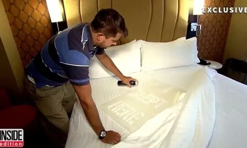 美國(guó)知名電視欄目“內(nèi)幕新聞”9月13日播出了一場(chǎng)“臥底實(shí)驗(yàn)”專題片:工作人員挑選了美國(guó)紐約9家高檔酒店入住一晚,第二天在結(jié)賬離開之前用一種特殊熒光劑在床單上寫下一句話“I SLEEP HERE”(我睡在這兒),還在枕頭上寫下“內(nèi)幕新聞”的LOGO。這些字,人的肉眼看不見,但很容易清洗掉,也很容易在紫外燈下顯示。