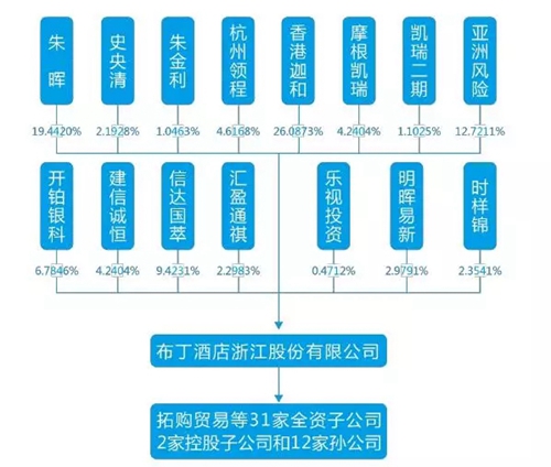 公告披露,董事長朱暉、董事朱金利、董事史央清三人直接和間接合計控制布丁股份32.63%的股份,為共同實際控制人,此外,樂視投資占股比例為0.47%。布丁股份擁有31家全資子公司、2家控股子公司和12家孫公司,股權結構如下圖所示: