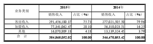 在報告期間,布丁股份2015年度、2014年度的主營業務分別為3.85億元、3.46億元,其中客房銷售收入占比最大,分別為2.91億元、2.77億元,而加盟銷售收入分別為0.77億元、0.56億元。