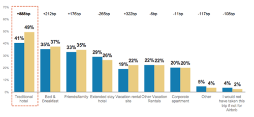 比起其他類型的住宿,Airbnb用戶拋棄酒店的速度要快得多。