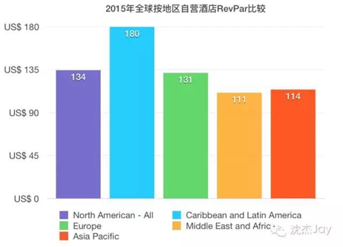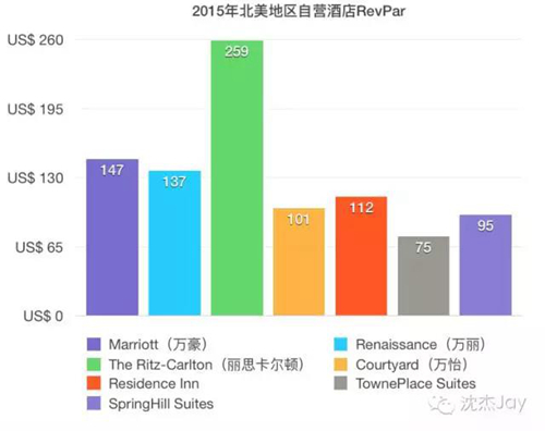 2015年各品牌的RevPAR均較前一年有提升,從品牌上來看,北美地區(qū)麗思卡爾頓的RevPAR達(dá)到了259美元,遠(yuǎn)遠(yuǎn)高于其他品牌。