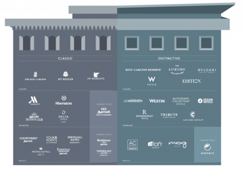 下圖是萬豪對其30個酒店品牌、度假村俱樂部和長住品牌的分類: