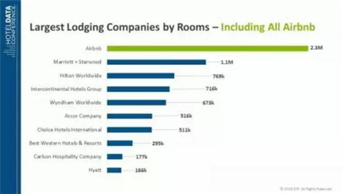 一年前在討論 Airbnb 與酒店業的競爭關系時,最受關注的還是諸如“房間數”這樣的問題,行業調研機構STR Global 的數據顯示,目前 Airbnb 在全球近 3 萬個城市所能提供的房源總數,已經超過了 230 萬個,增長速度相比前兩年仍有提升。這個數字,相當于全球最大的酒店集團“萬豪+喜達屋”組合客房總數的兩倍有余。