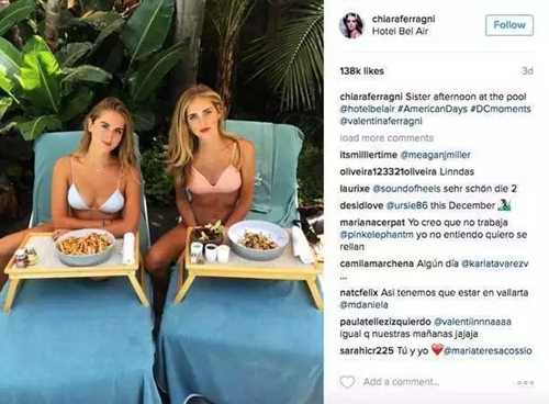 全球最火的時尚博主Chiara Ferragni拉著做設(shè)計的妹妹一起,兩個人輪流在Instagram發(fā)同一張照片,定位都是Hotel Bel Air。真是名副其實的“網(wǎng)紅”酒店。