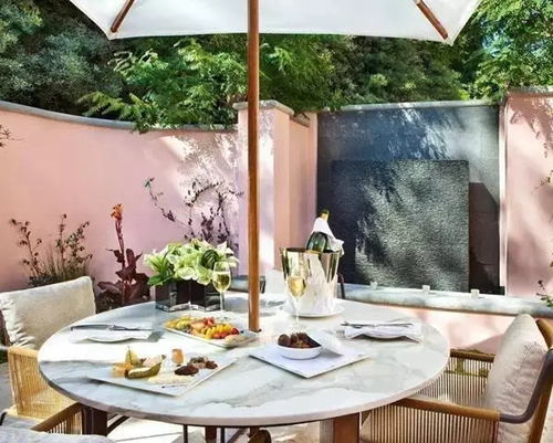 整個酒店的主色調(diào)就是去年潘通公司評出來的年度色——玫瑰石英粉,更多了點布達(dá)佩斯大飯店的味道,離比弗利山莊也不遠(yuǎn),總之一切都很夢幻……