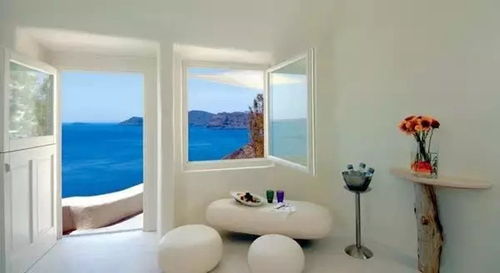 所有套房都有面朝大海的露臺,可以盡情欣賞湛藍(lán)的地中海、全景火山、和圣托里尼獨(dú)有的峭壁上的純白建筑。