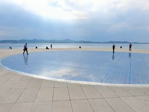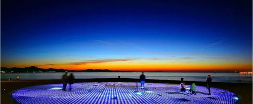 Baši?還在親水廣場上裝置了Greeting to the Sun(向太陽致敬),它由300層玻璃板組成,白天收集太陽能,晚上則由其內置的LED,模擬海浪動畫,光影變幻,讓人可以隨著電子波濤翩翩起舞。