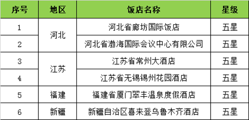 新聞來源:宏輝智通 發布日期:2016-12-15 瀏覽次數:3133河北省廊坊國際飯店、河北省渤海國際會議中心有限公司、江蘇省常州大酒店、江蘇省無錫錫州花園酒店等六家飯店的五星級旅游飯店資格。