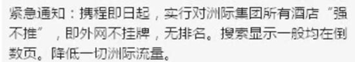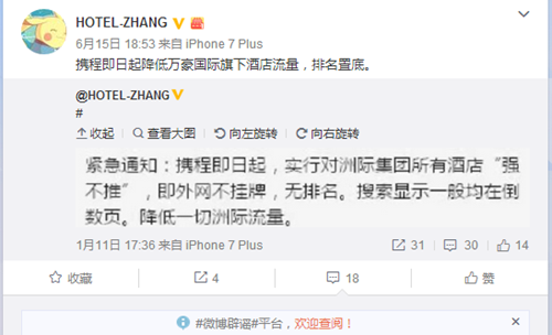 早在今年1月11日,“HOTEL-ZHANG”也發(fā)布微博曝光過攜程類似行為,“緊急通知:攜程即日起,實行對洲際集團(tuán)所有酒店強(qiáng)不推,即外網(wǎng)不掛牌,無排名。搜索顯示一般均在倒數(shù)頁。降低一切洲際流量。”