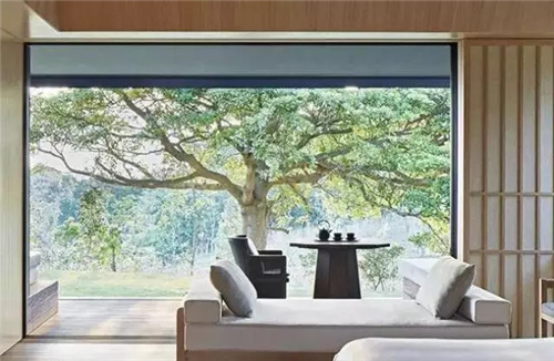 整體的設計有落落大方的大家風范。白色橡木咖啡桌,桌椅沙發與大地色織物的色調相得益彰。24間套房和4棟雙臥別墅傳承日本溫泉度假勝地的傳統,每一間都配備私湯。浴室的設計更加傳統而簡潔,炭黑色的地磚“升起”方形的浴缸,大幅落地玻璃將窗外的四季花園美景嵌入私人溫泉中。