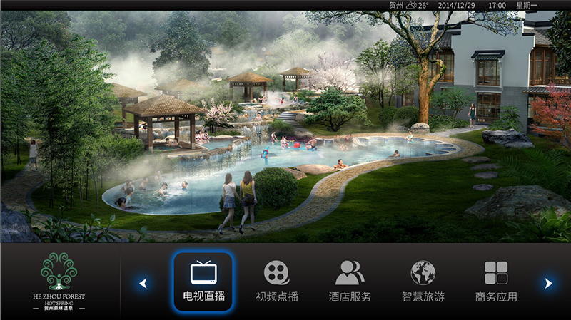 新聞來源:宏輝智通 發布日期:2015-11-29 瀏覽次數:10095"輝視"智能酒店互動視訊系統是為寬帶網上承載廣泛的VOD點播系統而提供的整套方案,采用“業務與承載分離、管理與服務分離”及“集中式管理、分布式服務” 架構思想、分層建議、分級管理,整個系統按功能主要分為五個層次:接入層、網絡承載層、媒體層、控制層、業務層,讓我們成為時代的酒店智能客房。廣西賀州溫泉酒店安裝“輝視”IPTV視訊系統