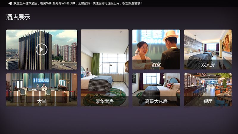 餐飲服務:以文字、視頻、圖片、幻燈片等方式,介紹酒店餐飲、酒水、預購電話提示,也可和酒店PMS對接 實現下單功能,需收費實現